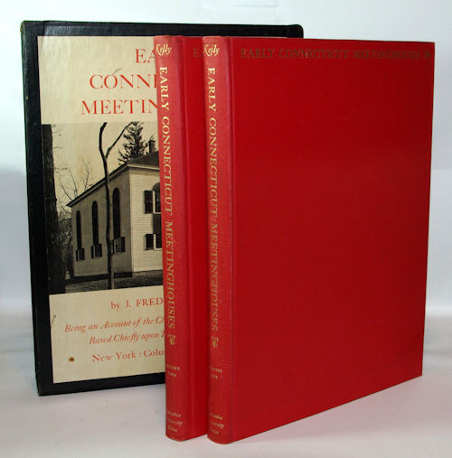 Kelly, J. Frederick:  Early Connecticut Meetinghouses Being an Account of the Church Edifices Built Before 1830 Based Chiefly upon Town and Parish Records.  New York: Columbia University Press, 1948. First Edition, First printing. Both volumes in this two volume set are in near fine condition in red cloth covered boards with gilt text stamping on the spines and across the upper edges of the front boards. Without dust jackets as issued; however, the books are contained in a very good paper covered and illustrated slip case with little if any wear. We have to point out that these two volumes, even after spending a year in solitary confinement with a deodorizer, still have a mild odor to them. It is not repugnant, just noticeable. Both volumes are quartos measuring 12 by 9 inches and both volumes have a slight musty odor. Volume I contains 332 pages and volume II contains 360 pages including an index. Both are heavily illustrated with black and white photographs some with photographic details such as doors and windows augmented with floor plans and sketches of truss work. A handsome, clean and tight set with no prior ownership markings of any kind. Extremely uncommon. (Roos, 649)
