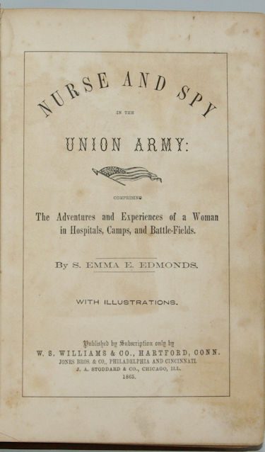 Edmonds, Emma E.:  Nurse and Spy in the Union Army.  Hartford: W. S. Williams & Co., 1865. First Trade Edition. Very good in decorated brown cloth covered boards with blind embossing on the front and rear boards with slightly faded gilt text stamping on the spine with the cloth worn through at the head and heel of the spine and with wear to the rear joint and with moderate foxing to the preliminaries. The hinges remain tight and strong. 384 pages of text with the frontispiece of the author missing and eight wood and steel engravings. "A sensational account of a woman in the front lines...." (Nevins II, 125)