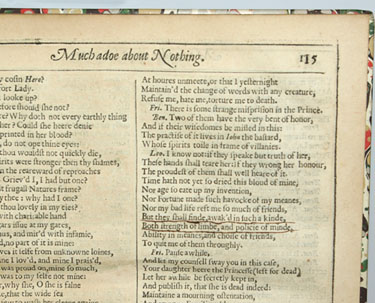 Shakespeare, William:  Much Ado About Nothing and Love's Labour's Lost.  London: [Printed by Tho. Cotes for Richard Hawkins], 1632. Removed from the Second Folio Edition. Two comedic plays by William Shakespeare removed from the Second Folio of 1632 bound together in a near fine small quarto of 1/4 polished, brown leather and marbled paper covered boards with gilt text on the spine. The only flaw to the binding being a small, 3/8 by 3/4 inch piece of the marbled paper near the upper center of the rear board is missing. The flaw is easily overlooked and can only be found rubbing one's fingers over the rear board. The pages in the text block are generally cockled and show a number of scattered spots of foxing. Page 115 of Much Ado About Nothing show two lines underlined in ink. That play is contained within pages 101 to 121 and is said to have been written in 1599 and was first printed on August 23, 1600. Love's Labour's Lost is on pages 122 to 144 and is said to have been written in 1592 and first printed in 1598. Both plays are printed in double columns with borders surrounding each column. (Jaggard, p.378 & p.418; Bohn, p.274, p.277, p.2256)