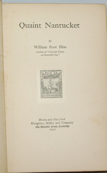 Bliss, William Root:  Quaint Nantucket.  Boston: Houghton, Mifflin and Company, 1896. First Edition. Very near fine in the publisher's original light green cloth covered boards with gilt text on the spine and black text and the sketch of a windmill on the front board. A small octavo of 7 5/8 by 5 inches with very modest rubbing to the cloth at the head of the spine, the cloth over the spine is very slightly faded and there is a prior owner's name stamped on the front fixed end page. Without its issued dust jacket if it ever had one. 225 pages of text. The author's preface states: "This book relates to the quaint Nantucket which existed for two hundred years before the island was discovered by 'the summer boarder'." (Crosby, Nantucket in Print, p.161)