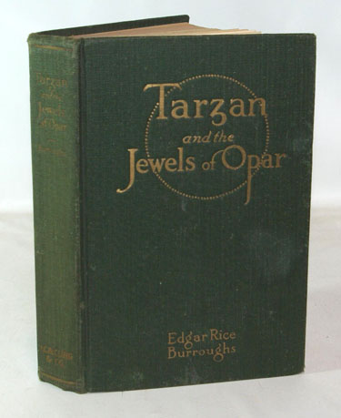 Burroughs, Edgar Rice:  Tarzan and the Jewels of Opar.  Chicago: A. C. McClurg, 1918. First Edition. Very good in its original green cloth covered boards with tarnished gilt text on the spine and with bright gilt text on the front board. A 12mo of 7 1/4 by 5 inches with the cloth worn through over the tips of the boards and a very slight concave appearance to the spine.. Without its issued dust jacket. 350 pages of text followed by two leaves of ads for other Burroughs titles. Illustrated with a frontispiece and 7 plates from paintings by J. Allan St. John. The contents are clean, tight and free of foxing, tanning or any prior ownership markings of any kind.