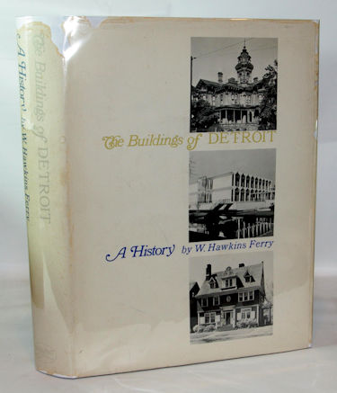 Ferry, W. Hawkins:  The Buildings of Detroit.  Detroit, Mich.: Wayne State University Press, 1968. First Edition. Fine in heavy dark blue cloth covered boards with gilt and black text on the spine and on the front board. A quarto of 12 by 9 inches. In a fair, price clipped dust jacket with a number of large chips to the upper edge of the spine area and to the fore edge of the front panel and to the fold to the front flap. 479 pages including an index, chapter notes, references and text. Illustrated with a frontispiece from two images and 466 black and white images from photographs.