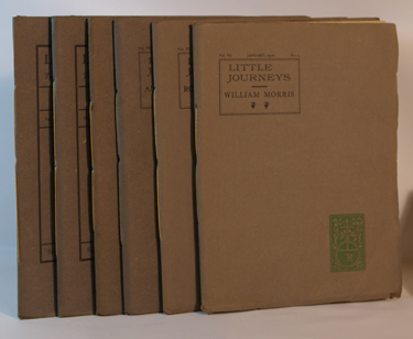 Hubbard, Elbert:  Little Journeys to the Homes of English Authors Vol. VI Numbers 1 thru 6.  East Aurora, New York: Roycrofters, 1900. . All six volumes are in very near fine to very good condition in heavy printed, paper wraps with a sewn thread binding. All are small octavos measuring 8 by 6 inches. The contents of each are fine with no foxing, tanning or notations. These volumes include William Morris, Robert Browning, Alfred Tennyson, Robert Burns, John Milton and Samuel Johnson.