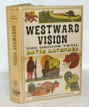 Lavender, David:  Westward Vision.  New York: McGraw-Hill, 1963. First Edition, First printing. Near fine in light yellow cloth covered boards with red text stamping and decorations on the spine with the front free end page tanned due to something having been laid-in for too long. In a near fine dust jacket with the price intact, but with two small nicks to the top edge of the spine area and with the that spine area slightly tanned. With illustrations by Marian Ebert. The 5th book in the American Trails series which deals with the Oregon Trail. 424 pages including an index, bibliography and text.