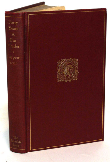Larpenteur, Charles:  Forty Years a Fur Trader on the Upper Missouri.  Chicago: The Lakeside Press, 1933. First thus. Very good+ in decorated red cloth covered boards with a gilt top edge to the text block. The cloth at the head and heel of the spine show slight rubbing. The gilt text on the spine is slightly tarnished. The end sheets are foxed due to a reaction with the glues used in binding which is typically seen with this title. With an historical introduction by Milo M. Quaife. This narrative was first published in New York in 1892. It describes in broad detail the treatment of the Indians by the fur traders operating in the Northwestern frontier from 1833 to 1871. It is also considered one of the best authoritative descriptions of the fur trade along the upper Missouri River.