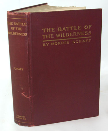 Schaff, Morris:  The Battle Of The Wilderness.  Boston: Houghton Mifflin Company, 1910. First Edition. Very good+ in maroon cloth covered boards with gilt text on the spine and front board. An octavo of 8 1/8 by 5 1/4 inch with rubbing to the cloth at the head and heel of the spine and with a bruise and a small dent to the spine about 4 inches up from the heel and with a prior owner's name on the second free end page. Without a dust jacket. 345 pages of text. Illustrated with a double page frontispiece map of the Wilderness Battle and four plates of maps. Except for a 1/2 inch stain on the second to last page of text there is no damage or markings to the contents. The hinges and joints are strong and tight.