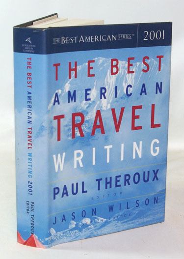 Theroux, Paul:  The Best American Travel Writing 2001.  Boston: Houghton Mifflin Company, 2001. First Edition, First Printing. Fine in charcoal gray cloth covered boards with silver colored text on the spine. An octavo of 8 1/4 by 5 3/8 inches. In a fine, unclipped dust jacket. This title is edited and with an introduction by Paul Theroux. The series editor is Jason Wilson. Signed by the author on the title page without an inscription or date. 418 pages. A collection of 26 reprinted stories and essays from various magazines.