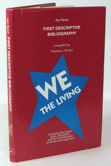 Perinn, Vencent L.:  Ayn Rand: First Descriptive Bibliography.  Rockville, Maryland: Quill & Brush, 1990. First Edition. Fine in bright red cloth covered boards with gilt text on the spine and on the front board. An octavo of 9 by 6 inches. In a very good+ unclipped dust jacket with light rubbing to the panels. 92 pages including an index.