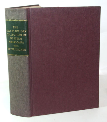 Decker, Peter:  A Descriptive Check List Together With Short Title Index Describing Almost 7500 Items of Western Americana Formed by George W. Soliday.  New York: Antiquarian Press, Ltd., 1960. Reprint of 1960. Near fine in purple cloth covered boards with a gilt on black title block on the spine. A small quarto of 9 1/2 by 6 1/2 inches. Without a dust jacket as issued. One of only 550 copies printed. This copy is out of series. A reprint of the Bent Bibliography of the White Mountains first published in 1940 to 1945.