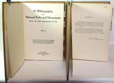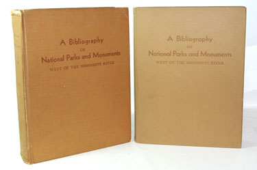 Compiled at the Western Museum Laboratories of the National Park Service with assistance by the Work Projects Administration and the CCC.:  A Bibliography Of National Parks and Monuments West Of The Mississippi River (Vols 1 and 2).  Washington, DC: U.S. Department of the Interior, National Park Service, WPA and CCC, 1941. First Edition. Both volumes of this complete two volume set are in very good+ and near fine conditions. Both are small quartos of 10 1/4 by 7 3/4 inches bound in adhesive bindings in light brown cloth covered boards with darker brown text on the spines and front boards. The cloth at the head and heel of volume I is rubbed and worn and the upper fore corners of the front and rear boards are bumped, but professionally straightened and strengthened. Volume II shows only light wear to the cloth at the head of the spine and the text block for this volume was made from two-hole punched paper. Volume I is made from standard, un-holed paper. Both volumes contain four index tabs each. In volume I: Northwest Inland States; Pacific States; Yellowstone; and, Yosemite; Volume II: Central States, Southwestern National Monuments; Southwestern States; and, Territorial Parks and Monuments. These two volumes contain 664 pages of bibliographies on 79 national parks and national monuments each one with its own pagination. This bibliography is not listed in any of the WPA or American Guide resources held by Town's End Books. OCLC locates only five institutions owning the book version of this title. The forward contained in volume I mentions that this project started in 1936 with: where "much credit is due Mrs. Hazel Hunt Voth for originally laying out the program and directing it until her resignation in April, 1939." Hazel Voth's other other major accomplishment was A Bibliography of Yellowstone National Park which is reprinted in this set.