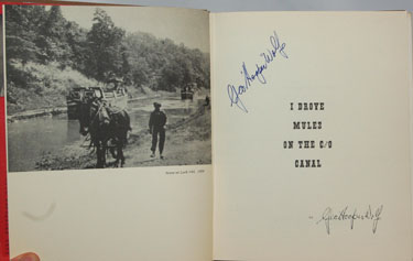 Wolfe, George "Hooper":  I Drove Mules On The C and O Canal.  Dover, Del.: Dover Graphic Associates and Woodwend Studio, (1969). First Edition. Near fine in light brown cloth covered boards with a printed paper label on the front board. A small quarto of 10 by 8 inches. In a very good+, unclipped (no price) dust jacket with a long closed tear at the fold between the front panel and the spine area. Signed in flow pen on the title page by the author. 171 pages of text. Illustrated throughout from black and white photographs. Laid-in at the rear of this copy is a 16 page "Supplement To The First Edition" which provides a synopsis of the book, the C&O Canal Song and additional photographs. As of this writing there are no other copies of this title for sale on the Internet.