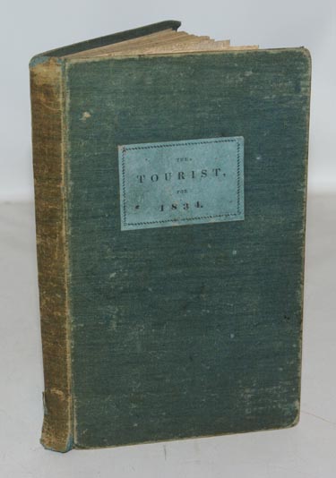 [Vandewater, Robert J.]:  The Tourist, Or Pocket Manual For Travellers On The Hudson River, The Western Canal And Stage Road To Niagara Falls Down Lake Ontario And The St. Lawrence To Montreal And Quebec Comprising Also The Routes To Lebanon, Ballston, And Saratoga Springs..  New York: Harper Brothers, 1834. Third Edition, Enlarged and Improved. Very good- and rebacked retaining the original backstrip and the original end sheets in its original binding of light blue cloth covered boards. A 24mo measuring 6 by 3 3/4 inches with rubbing to all edges of the cloth around the boards and with minimal rubbing to the paper title block affixed to the front board. The fold-out map is present with multiple folds and only minor losses in the margins. The title page shows an early prior owner's name and date of July 3, 1834 in pencil and the blank second to last end page repeats that name and date in pencil. That same page has been torn such that a 4 by 4 inch portion of the page has been removed. 95 pages of text followed by a blank page and 12 pages of ads from the publisher. A tourist's guide starting in Philadelphia to New York City then up the Hudson River to Albany and west on the Erie Canal. Containing interesting facts and features as they then existed along the routes taken. (Howes, V-28; Sabin, 98486