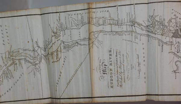 Board of Canal Commissioners:  The Official Reports of the Canal Commissioners Of The State Of New York And The Acts Of The Legislature Respecting Navigable Communications Between The Great Western and Northern Lakes and the Atlantic Ocean.  Newburgh, NY: B. F. Lewis & Shelton & Kewnsett, 1817. First Edition. Good in 1/4 leather and printed paper covered boards with text on the front board and advertisements on the rear board. An octavo of 8 7/8 by 5 1/2 inches with much of the printed paper around the edges of the front board worn away and abrasions to what remains. The contents show dampness stains throughout and there is an early prior owner's name at the upper fore corner of the first page of text. 112 pages of text. The three folding maps are missing. (Sabin, 53564)