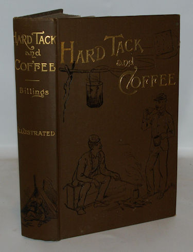 Billings, John D.:  Hardtack And Coffee or The Unwritten Story of Army Life.  New York: George M. Smith & Co., 1887. First Edition. Near fine in its original illustrated brown cloth covered boards with gilt text on the spine and front board and with an illustration of two soldiers on the front board. An octavo of 8 5/8 by 5 3/4 inches with only hints of rubbing to the cloth at the head and heel of the spine and over the tips of the boards. Without a dust jacket and probably as issued. 408 pages of text illustrated with a frontispiece, "six elegant color plates and over two hundred original sketches by Charles W. Reed" (from the title page). This first edition of John Billings' book of 1887 which relates his life as a common soldier in the Union Army from 1862 to 1865 while he served with the Tenth Independent Battery of Massachusetts. Allen Nivins in his bibliography of Civil War Books states: "The best source for the army life and fellings of a Federal soldier; this delightfully written and humorously illustrated work has righfully become a classic." A beautiful, tight and clean copy with no prior ownership markings of any kind. (Eicher, 449; Nivens, I, p.59)
