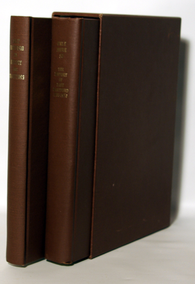 Paquette, Lee, and Joseph O. Goodwin:  East Hartford: Its History and Traditions And Only More So The History of East Hartford 1783-1976 (two volumes in slip case).  East Hartford, Conn.: The Raymond Library Company, 1976. First Edition, First printing. Both volumes of this two volume set are in fine condition in brown cloth covered boards with gilt text stamping on the spines. On the verso sides of both first free end pages a prior owner has carefully attached a paper pocket to contain a newspaper article on each of the respective books. Both volumes have a prior owner's address label affixed to the lower edge of the front pastedown. Without dust jackets as issued. Both volumes are contained within a fine, brown cloth covered slip case. Only More So The History of East Hartford 1783-1976 is signed by its author and dated in the year of publication on the first free end page. East Hartford: Its History and Traditions by Goodwin is a facsimile reprint of the original edition of 1879. It contains 249 pages including an index and is illustrated with a map showing the location of some of the locations of East Hartford's early settlers. Only More So The History of East Hartford 1783-1976 by Lee Paquette contains 336 pages including an index, text and is illustrated with a section of black and white photographs with an early map frontispiece.