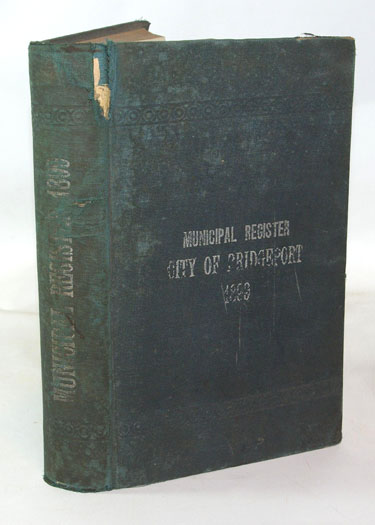 City of Bridgeport, Connecticut:  Municipal Register Of The City of Bridgeport for 1899.  Bridgeport, Conn.: T. W. Joyce Printing Co., 1899. First Edition. Fair in it original dark green cloth covered boards with faded silver text on the spine and the same on the front board together with blind embossing on both boards and the spine. An octavo of 8 3/4 by 5 1/2 inches with the cloth torn by 1 1/2 inches at the upper corner of the front board and with the cloth worn through at the tips of the boards. Without a dust jacket. 552 pages including messages from the mayor and financial reports for the city.