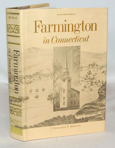 Bickford, Christopher P.:  Farmington in Connecticut.  Farmington, Conn.: The Farmington Historical Society, c1988, 2008. Second Revised Edition, Reprint of 2008. Fine in 1/4 brown cloth and illustrated cloth covered boards with decorated end papers. An octavo of 9 by 5 7/8 inches. In a fine, unclipped dust jacket. The first edition of this title was published in 1988 and consisted of only 2,000 copies. 462 pages containing an index, chapter notes, text, images from photographs and maps.