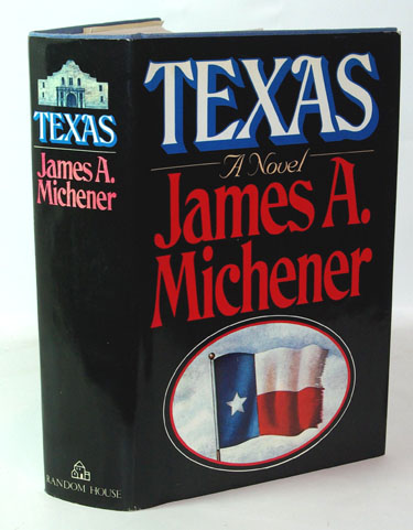 Michener, James A.:  Texas.  New York: Random House, 1985. First Edition, First printing. Near fine in blue cloth covered boards with copper colored text stamping on the spine and a copper colored decoration stamped on the front board. A small quarto of 9 1/8 by 6 1/8 inches. In a very near fine, unclipped dust jacket with a small snag at the upper edge of the rear panel. An historical fiction saga of Texas which spans 450 years of its history from the first Spanish explorers. 1,096 pages. A very clean and handsome first edition copy with no prior ownership markings of any kind.