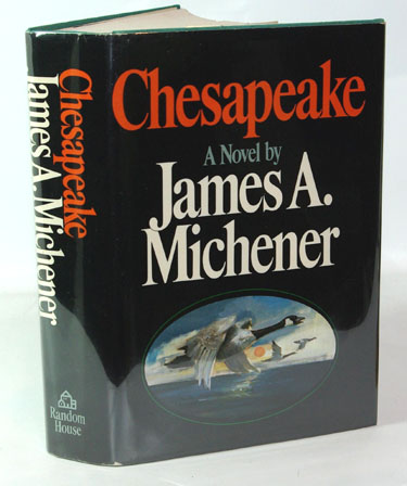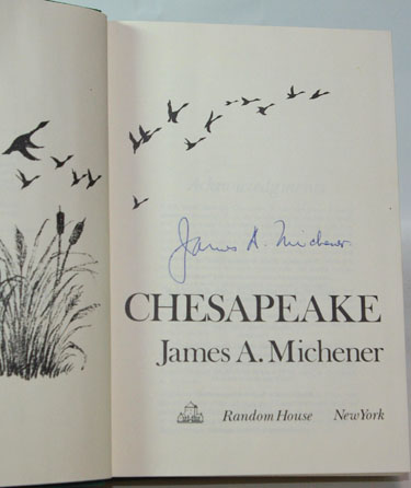 Michener, James A.:  Chesapeake.  New York: Random House, 1978. First Edition, First Printing. Near fine in blue-green cloth covered boards with copper colored text stamping on the spine and with an embossed decoration of grass on the front board. The cloth on the boards is very faintly mottled as is often seen with this title and there is a slight lean to the spine. In a near fine unclipped dust jacket with very light rubbing to the ends of the spine area. Signed by the author on the title page without a date or a inscription. 856 pages of text. A very clean and handsome copy without an prior ownership markings.