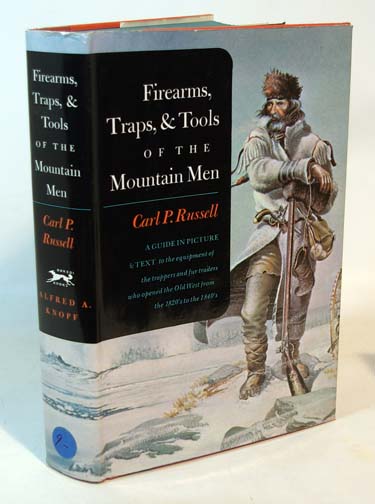 Russell, Carl P.:  Firearms, Traps, & Tools of the Mountain Men.  New York: Alfred A. Knopf, 1967. First Edition, First printing. Near fine in red and bright orange cloth covered boards with a gilt on green title block on the spine and a gilt stamped decoration on the front board. In a very good+ price clipped dust jacket with one inch closed tear to the upper edge of the rear panel. "A guide in picture and text to the equipment of the trappers and fur traders who opened the Old West from the 1820's to the 1840's." A small quarto measuring 9 1/4" by 6 1/4" containing 448 pages followed by an index. Illustrated throughout with more than 400 drawings and sketches of tools, weapons and implements used by the fur traders and mountain men of the era.