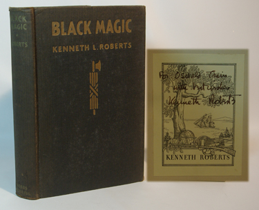 Roberts, Kenneth:  Black Magic.  Indianapolis: Bobbs-Merrill Co., 1924. First Edition. Very good in black cloth covered boards with faded gilt text stamping on the spine and on the front board. An octavo measuring 8 1/2" by 5 1/2" with a 1/8" hole in the cloth at the head of the spine and with fading of the cloth on the spine. Without a dust jacket. Signed and inscribed by the author on a Kenneth Roberts' book plate and signed a second time with "Best wishes" over his signature on the second free end paper. 250 pages illustrated with a black and white photographic frontispiece. A fairly scarce title and one seldom seen signed.