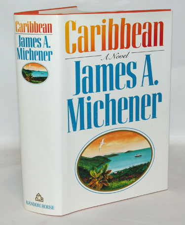 Michener, James A.:  Caribbean.  New York: Random House, 1989. First Edition, First Printing. Fine in bright orange cloth covered boards with bold gilt text on the spine and a floral design on the front board. A small quarto of 9 1/4 by 6 1/8 inches with map end sheets. In a fine, unclipped dust jacket. 672 pages of text A very clean and never read, tight copy with no prior ownership markings of any kind.