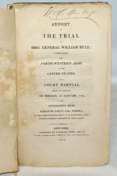 By A Gentleman Of The Bar:  Trial of Robert M. Goodwin In The Court of Sessions, For The City and County of New-York, March Term, 1820, On An Indictment of Manslaugher, For Killing James Stoughton, Esq In Broadway, In The City of New-York December 21, 1819..  New York: Printed by John Low, 1820. First Edition. A pamphlet in printed wraps in very good condition removed from a larger book with sewn pages with the first signature loose. This copy is contained within a heavy, blue paper chemise and a blue paper covered slipcase with a printed paper label on the spine end. An octavo of 8 3/8 by 5 1/4 inches with creasing to the first couple of pages at the corners. On the verso of the front flap of the chemise there is a prior owner's book plate by Rockwell Kent. 53 pages of text. A detailed summary of the four day trial culminating in the jury foreman announcing a verdict of guilty, but when the jury was polled individually the third juror said "not guilty". The judge instructed the jury to return to deliberate, but they were not able to come to a complete agreement. The court then discharged the jury whereupon Goodwin's counsel sought bail on a writ of habeas corpus. Bail was denied by the sitting judge, but after hearing arguments from counsel the matter was referred by certiorari to be taken up by one of the judges in the New York Supreme Court. Council for the defense "also stated it to be their intention to insist before that court, that the prisoner could not be tried again for the same offense, the jury having been discharged without their consent". That New York Supreme Court judge subsequently ruled in favor of bail which released Goodwin from custody. This writer has not been able to determine if Goodwin was brought to trial a second time or if he was free under the idea that one can not be tried twice for the same crime.