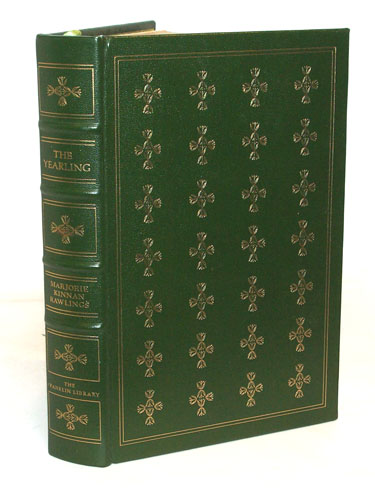 Rawlings, Marjorie Kinnan:  The Yearling.  Franklin Center: The Franklin Library, 1984. Limited Edition. Fine in gilt decorated, full bright red leather covered boards with gilt text and decorations stamped between three raised bands on the spine and with marbled end papers and gilt edges to the text block with a silk placement ribbon bound-in at the head of the spine. An octavo measuring 9" by 6". One of the volumes in The Franklin Library's collection of Pulitzer Prize Winners. The author won the Pulitzer Prize for Fiction in 1939 for this title. 380 pages of text with illustrations by Thomas B. Allen. A beautiful volume with no names, dates, plates or notations.