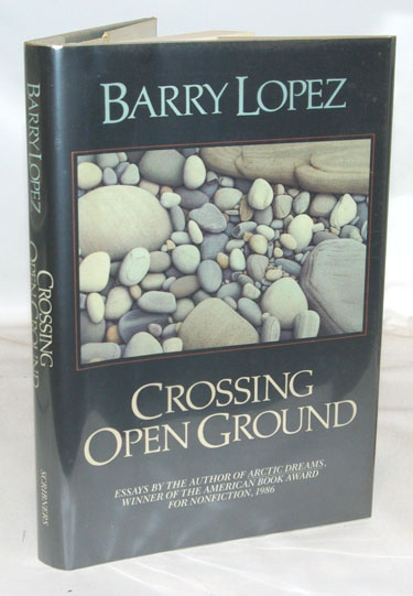 Lopez, Barry:  Crossing Open Ground.  New York: Charles Scribner's Sons, (1988). First Edition, First Printing. Fine in 1/4 tan cloth and light blue paper covered boards with copper colored text on the spine. An octavo of 8 7/8 by 6 inches with faint foxing around the edges of the text block. In a fine, price clipped dust jacket. Signed by author on fly title page without an inscription or date. 208 pages of text. A collection of 14 essays.