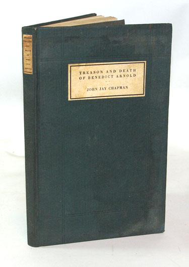 Chapman, John Jay:  The Treason and Death of Benedict Arnold, a Play for a Greek Theatre.  New York: Moffat, Yard & Company, 1910. First Edition. Very good+ in charcoal gray paper covered boards with printed, paper title labels on the spine and on the front board and with the top edge of the text block gilt. A small octavo of 8 by 5 inches with faint dampness stains on the outer edges of the front board with dampness stains to the margins of pages 17 through 24 and pages 41 through 48 with no impact on the printed text. There is a prior owner's book plate on the front paste down. Signed and inscribed to a "Miss Katherine _?___ | from John Jay Chapman" and dated "Oct 27 1911" on the fly title page. 75 pages of script followed by a one page add for other books by the author
