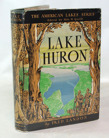 Landon, Fred:  Lake Huron.  Indianapolis: Bobbs-Merrill Company, 1944. First Editioni, Limited Edition. Fine in decorated green cloth covered boards with gilt text on the spine and gilt text and decorations on the front board. with only hints of rubbing to the cloth at the head and heel of the spine. In a very good+, unclipped dust jacket with light wear and rubbing to the ends of the spine area and to the lower edge of the front panel with a 1/4 inch closed tear. Signed by the author on the special, tipped-in page immediately after the first free end sheet. The first volume in The American Lakes Series edited by Milo M. Quaife. 398 pages containing an index and bibliographical notes. Illustrations on plates from black and white photographs. (Fitzgerald, AL3a)
